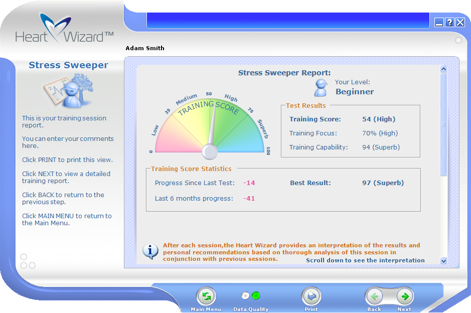 After each training session, you will see your achieved training results. The Heart Wizard™ will automatically adjust the level of your challenge to keep up your training performance. Using the Stress Sweeper regularly will help you to normalize your blood pressure, strengthen your immune system and improve overall health.