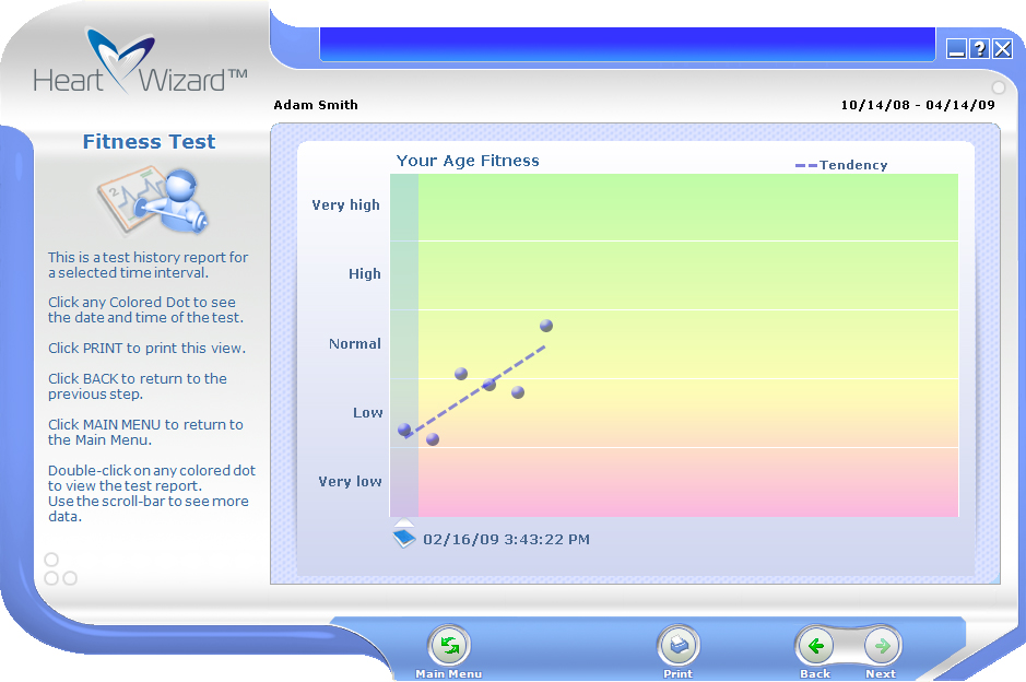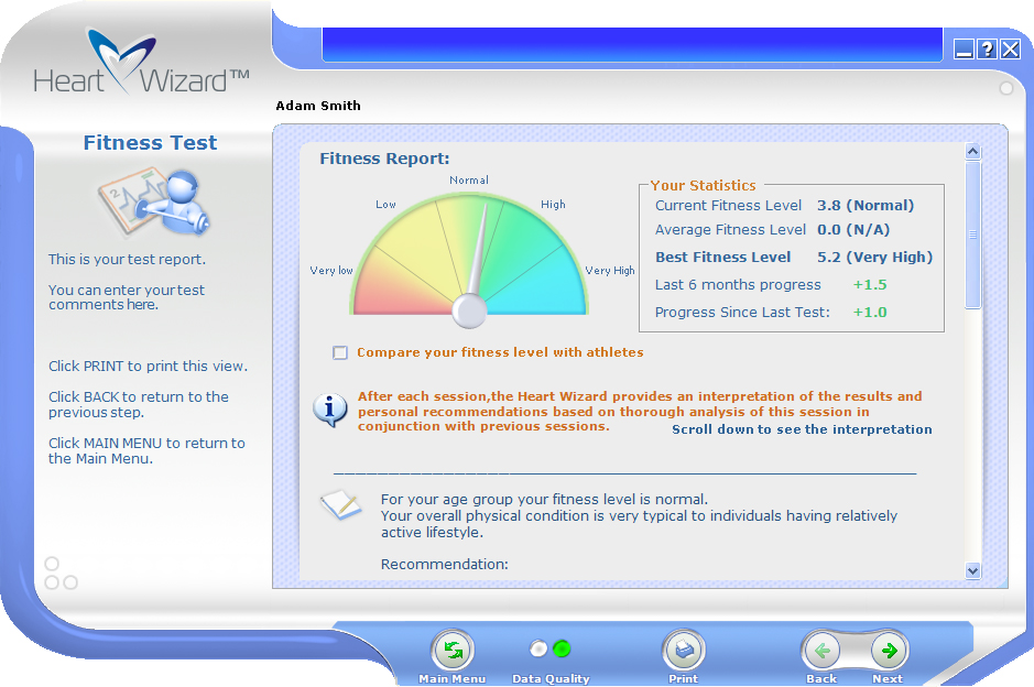 After you have completed the test, the Heart Wizard™ compares your results with predicted values from a large normative database of healthy individuals of your gender and age group and generates an assessment report. The report includes information about your current fitness level. This will help you to track the ability of your cardiovascular system to withstand physical exercise and show positive changes caused by your health improvement efforts like nutrition, fitness programs and other exercises that affect your body.