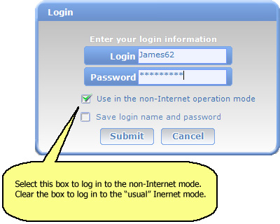 The user can choose the non-Internet operation mode when logging in. The same login name and password must be used in both Internet and non-Internet operation modes.